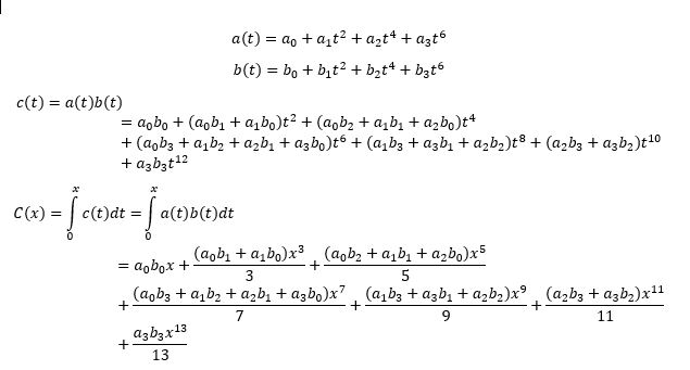 Expansion as truncated infinite power series and term-by-term integration of the integrals is illustrated in the following pictures.