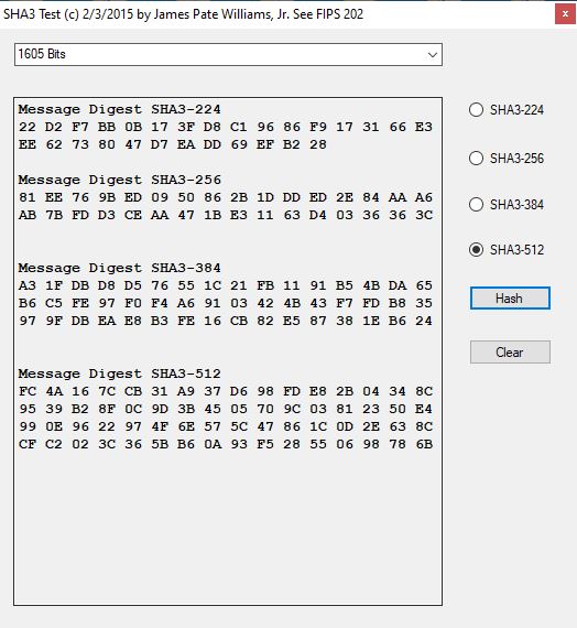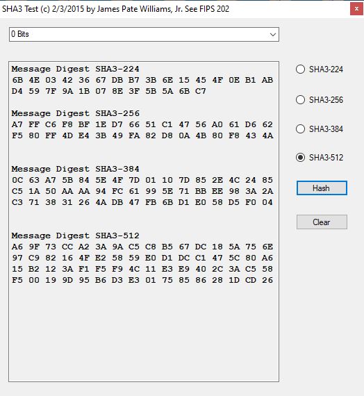Below are six tests of my February 3, 2015 SHA-3 implementation in C#. The tests use 0 bits, 5 bits, 30 bits, 1600 bits, 1605 bits, and 1630 bits.