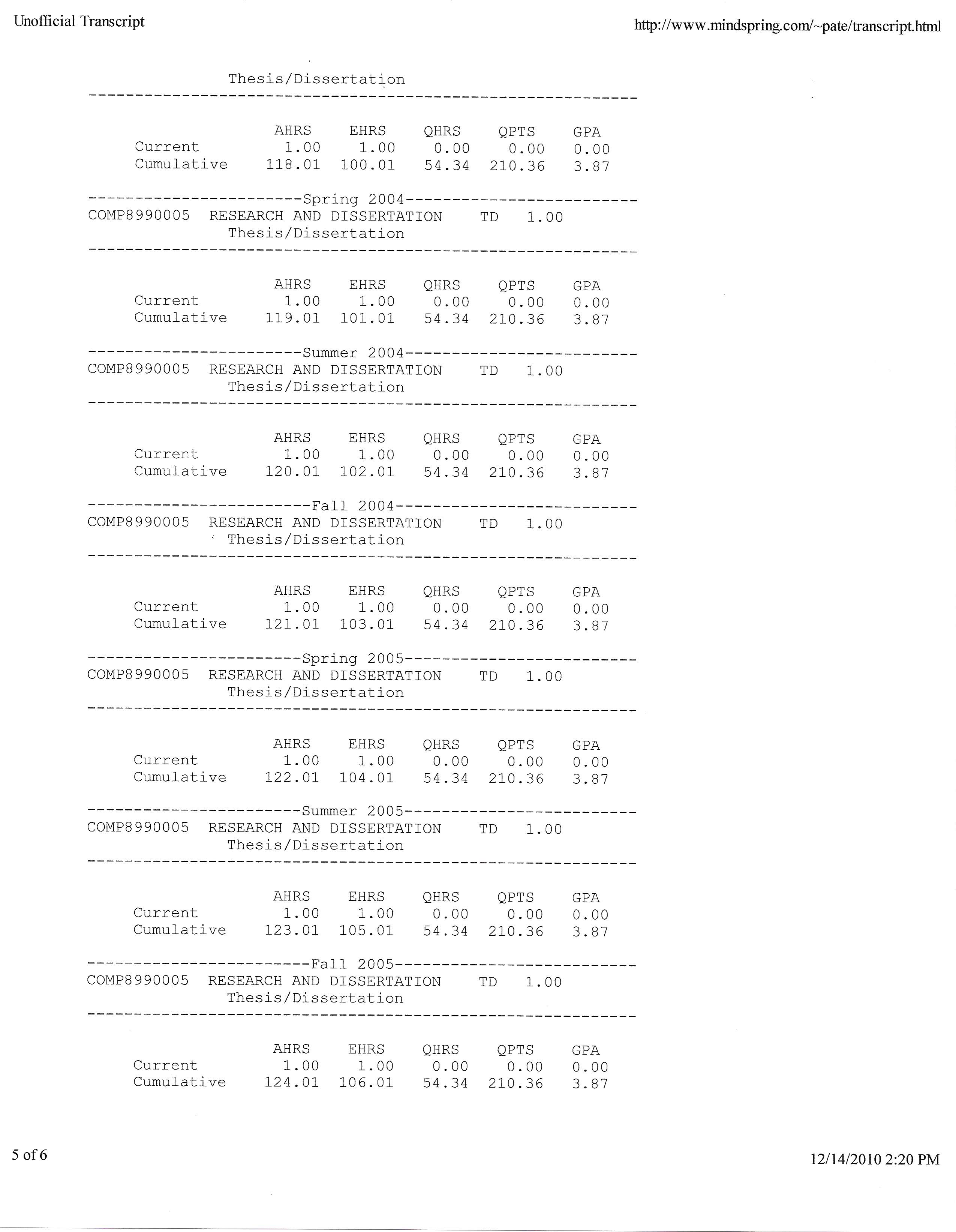 I matriculated at Auburn University as a Computer Science graduate student in Fall Quarter 1998. I believe the Professor Alfred J. Menezes was instrumental in getting me accepted at Auburn University. Professor Menezes left Auburn University in the 1990s and went to his old University, the University of Waterloo in Ontario, Canada. I graduated with a Master of Software Engineering in Summer Quarter 2000. I had a GPA of 3.880 out of 4.000. I went onto attain a Doctor of Philosophy in Computer Science in the Fall Semester 2005 with a 3.871 GPA.