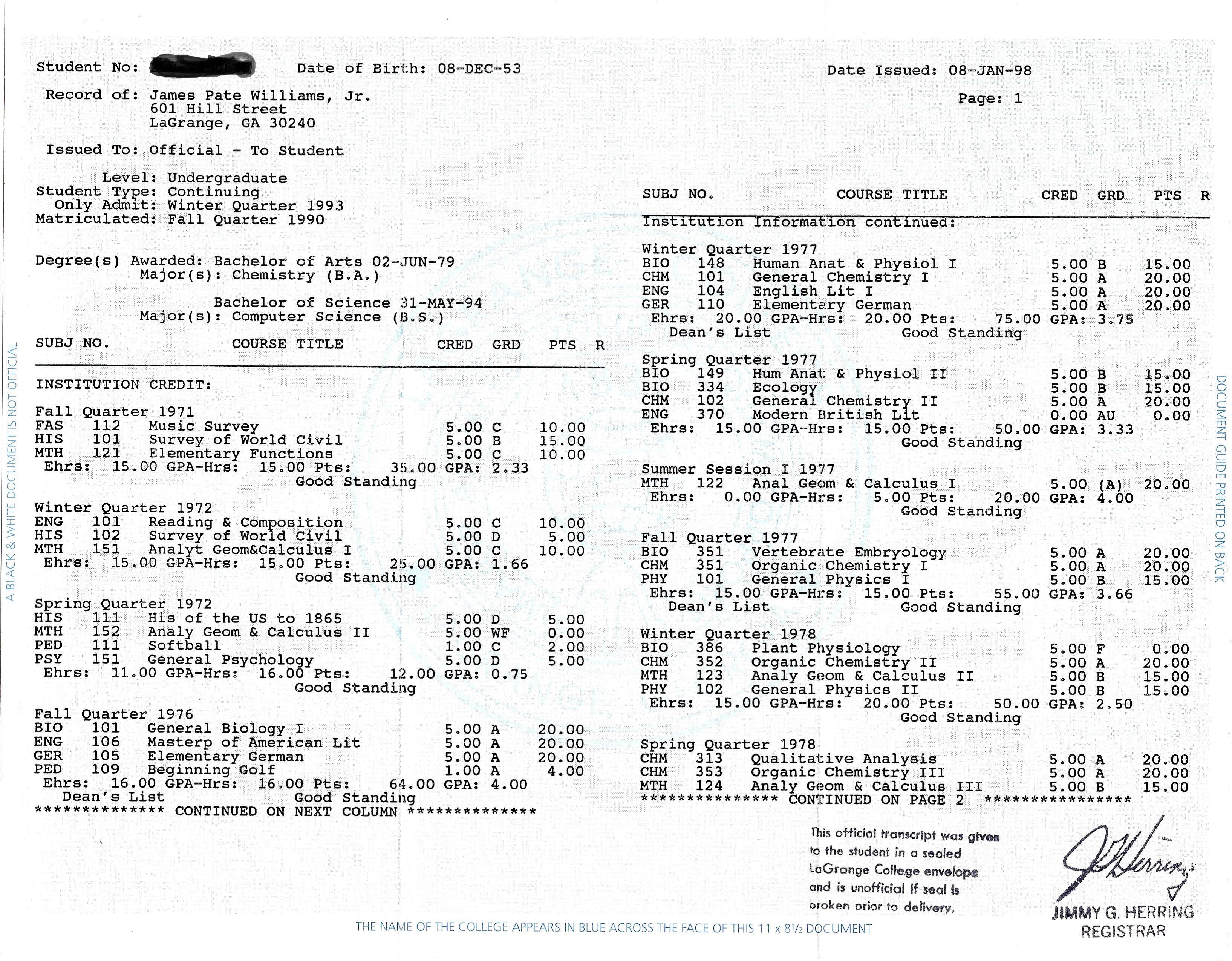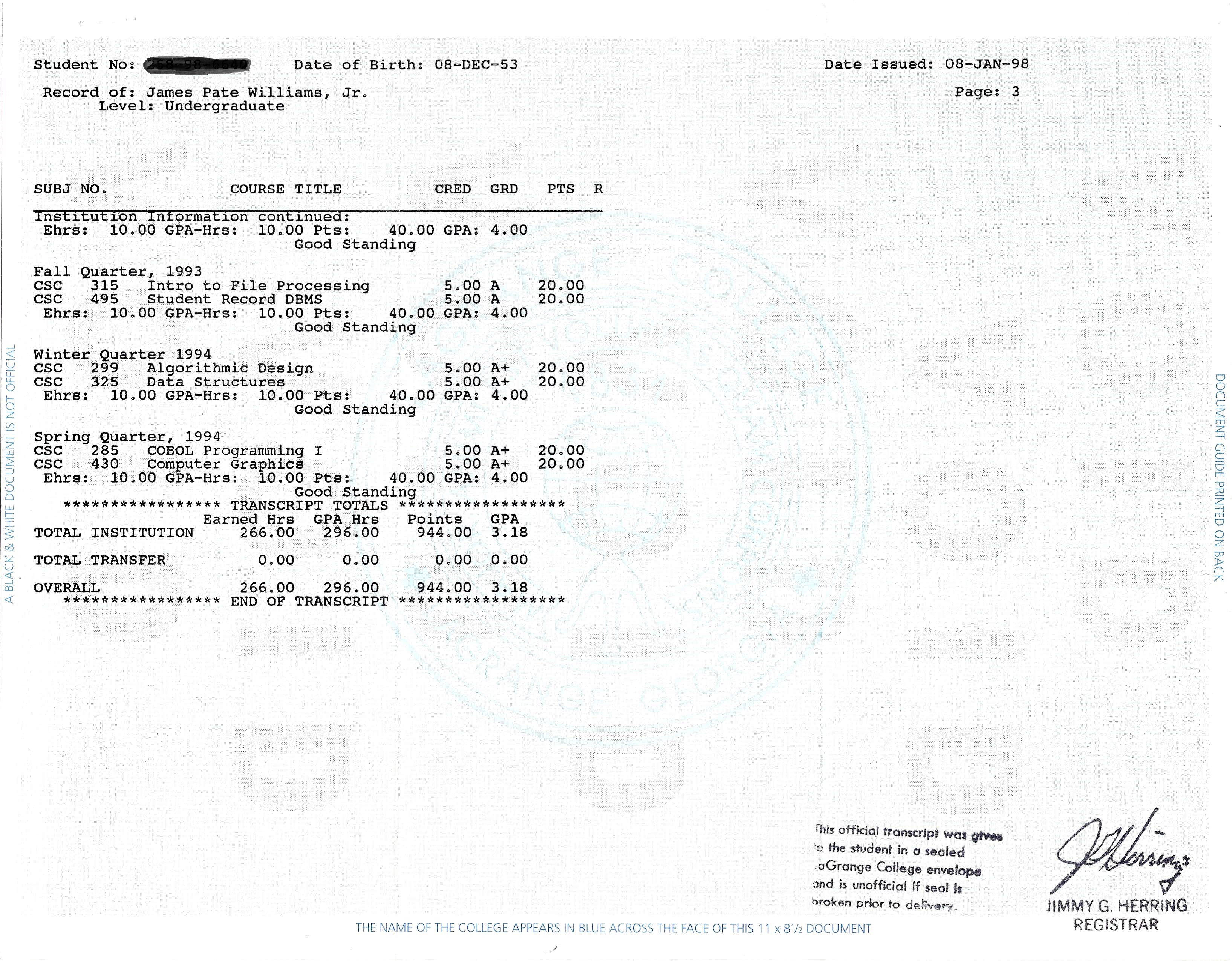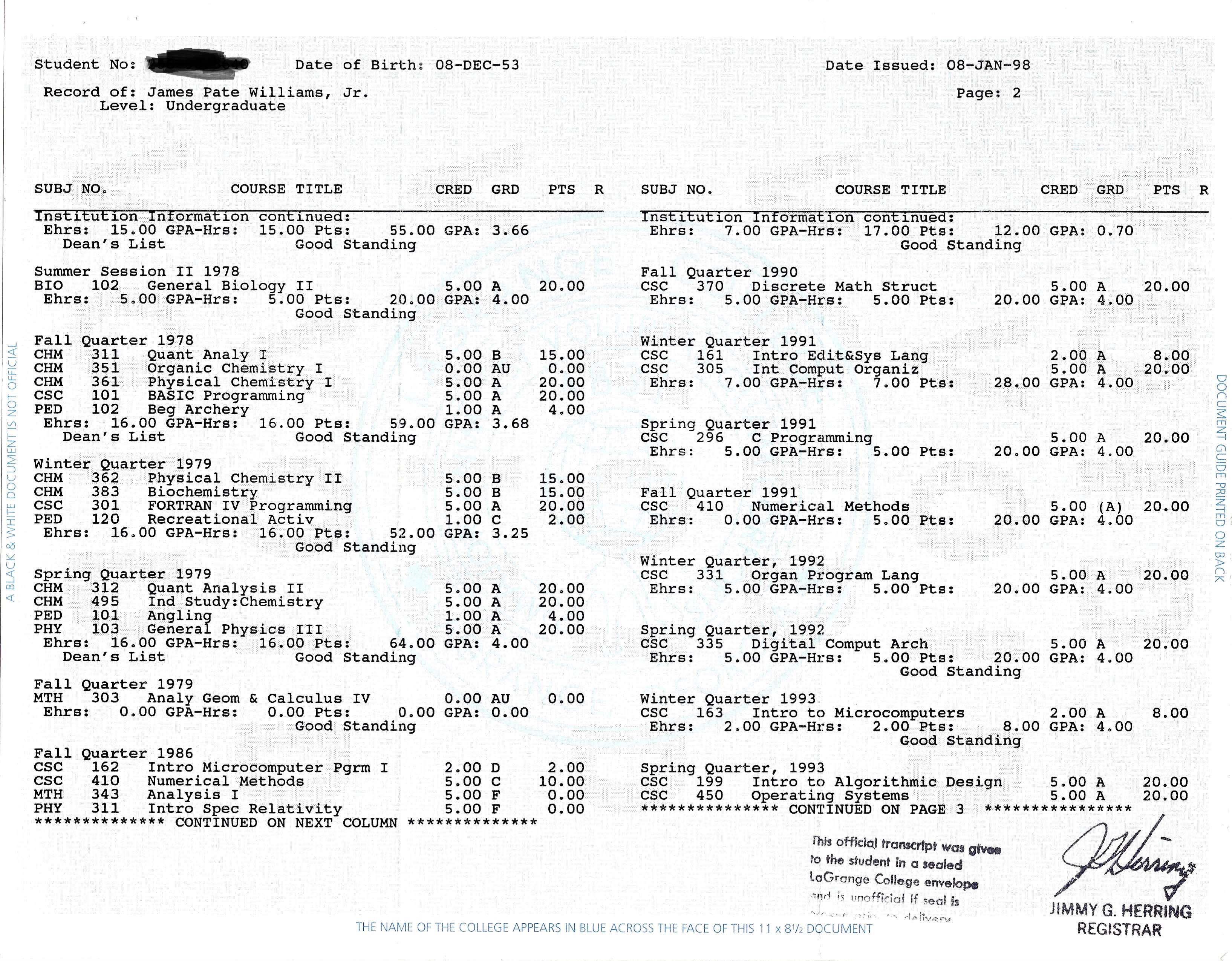 I returned to LaGrange College in the Spring Quarter of 1990. I graduated on June 2, 1994 with a Bachelor of Science in Computer Science. I had a 4.00 out of 4.00 in all my computer classes from 1990 until 1994.