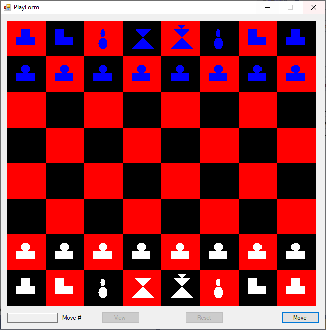 I started creating computer programs the Summer Semester of 2002 at Auburn University. I took a course named “Hand Held Software Development”. The course was taught by my research advisor Associate Professor Richard O. Chapman. I created a distributed chess playing client-server Internet system for human chess players. The program was built using the Palm Pilot’s Palm OS and its C language compiler. Later in circa 2006 I built a rule based and neural network chess program for a computer to play itself and for a human observer (voyeur). The language was Java. Then in 2015 I translated and enhanced my Java program by rewriting the code in C#. Below are pictures of one game.