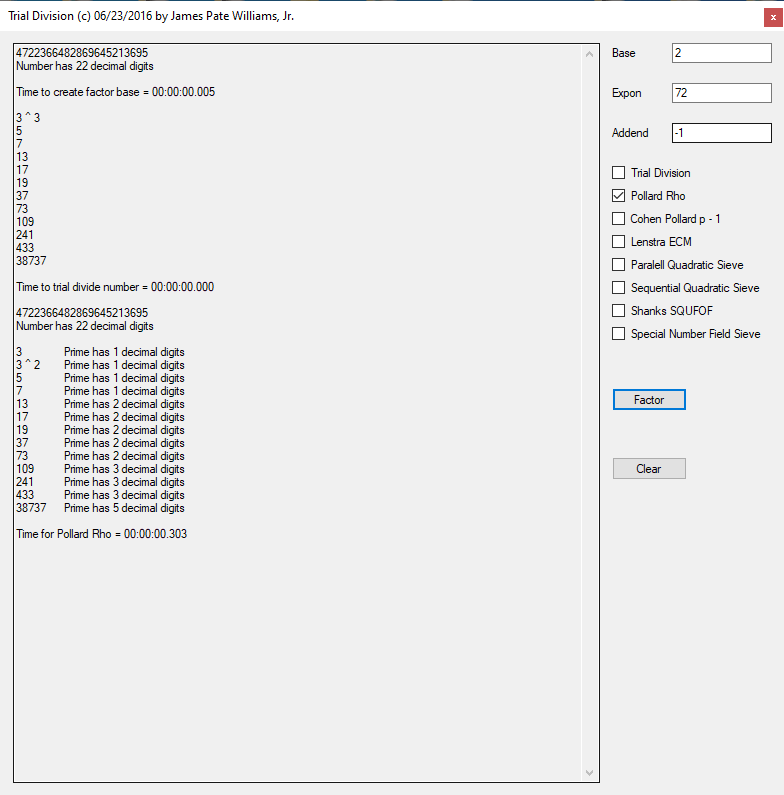 I very recently created a multiple precision signed integer package in C++ using the standard library and a base of 10. I then implemented two integer factoring algorithms trial division and Pollard’s Rho method. Trial division uses all the prime numbers <= 10000 and there are 1229 such primes. Due to the choice of language and the exceedingly small base the resulting application is awfully slow when compared to a similar C# application. The multiple precision signed integer package is largely based on translation of the Pascal source code found in “Prime Numbers and Computer Methods for Factorization” by Hans Riesel. The test number is 2 ^ 72 – 1 which is a Mersenne composite integer. The output large integers start with the number of base 10 digits in the number. For comparison I have included the output from my C# Big Integer factorization program as a screen shot.