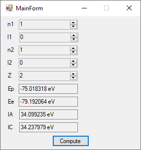 The Ep text box is the ground state energy as found by a first order perturbation computation. The Ee text box is the experimental ground state energy. The IA text box is the analytic electron-electron repulsion interaction determined by Schiff and other quantum mechanics researchers. The IC text box is my numerical contribution. All the energies are in electron volts.