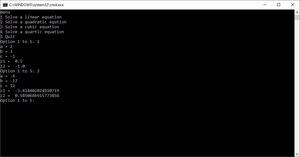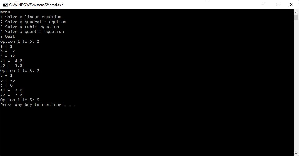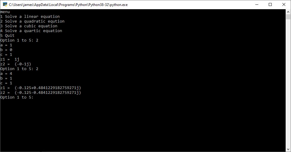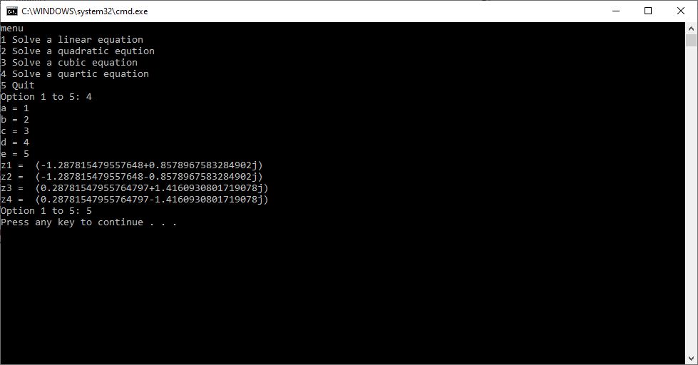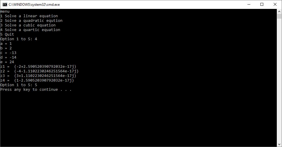Back in 2015 I created a C# application to solve quadratic, cubic, and quartic equations which are of degrees 2, 3, and 4, respectively. Yesterday I successfully translated the C# to the Python console. I bench-marked my computer programs against the online calculators on the following website:
