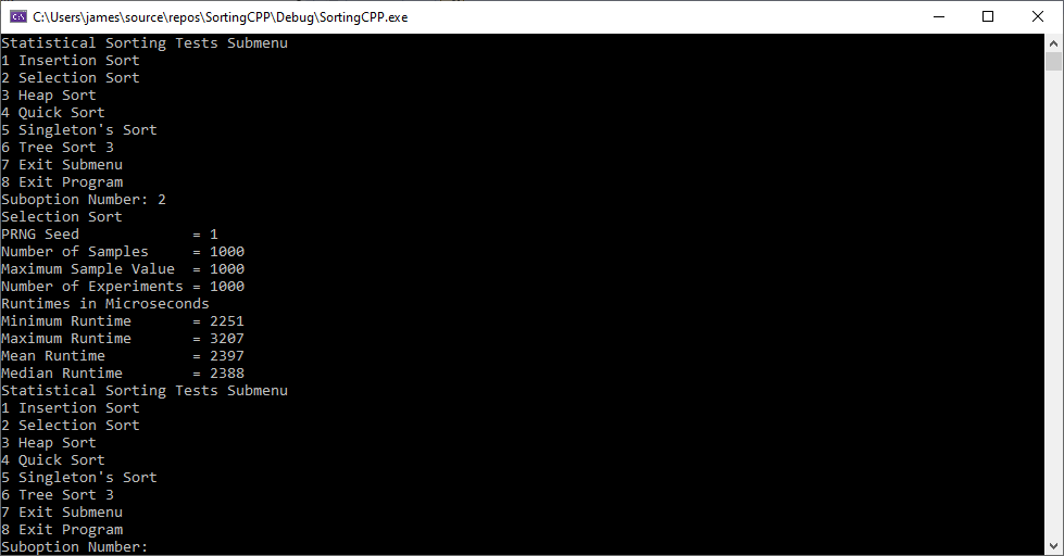 I read the treatise Sorting and Sort Systems by Harold Lorin in the summer of 1979. That excellent intellectual work inspired me to implement the code and and algorithms from that book. Lorin used Algol, FORTRAN and IBM’s language PL/I. I used the Data General Eclipse minicomputer at LaGrange College from which I had graduated with a Bachelor of Arts degree in Chemistry. I utilized the computer language BASIC (Beginner’s All-purpose Symbolic Instruction Code) and Data General’s Advanced Operating System Macro-assembly language. Later in my academic life at Auburn University I learned about Heap Sort. I wrote about six sorting algorithms on Facebook that I implemented in the C# computer language back in 2015. It took me two days to create a similar application using the C++ computer language. Here are some results and the source code in PDF file format.