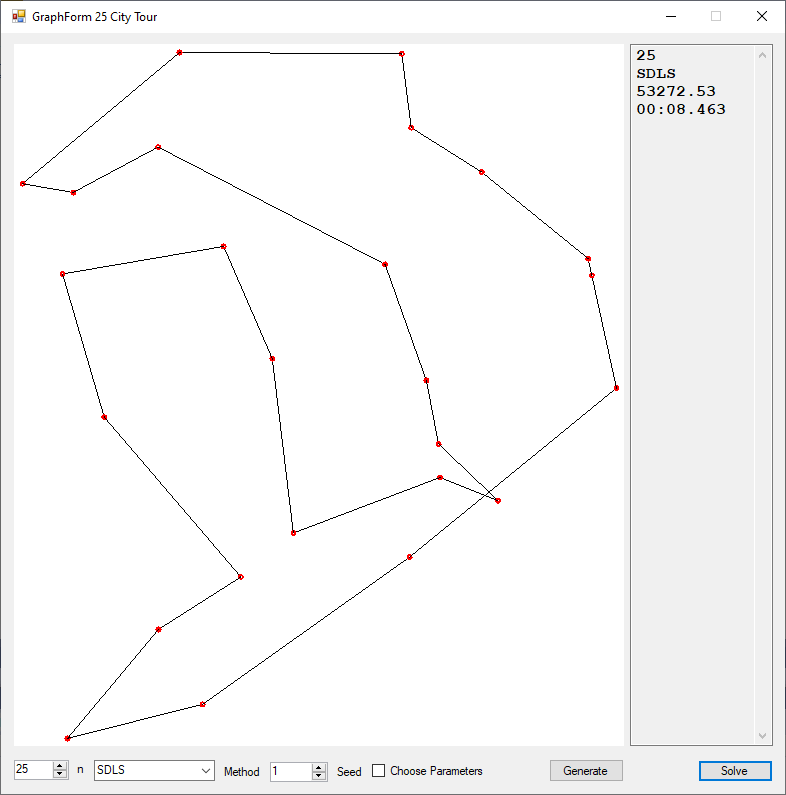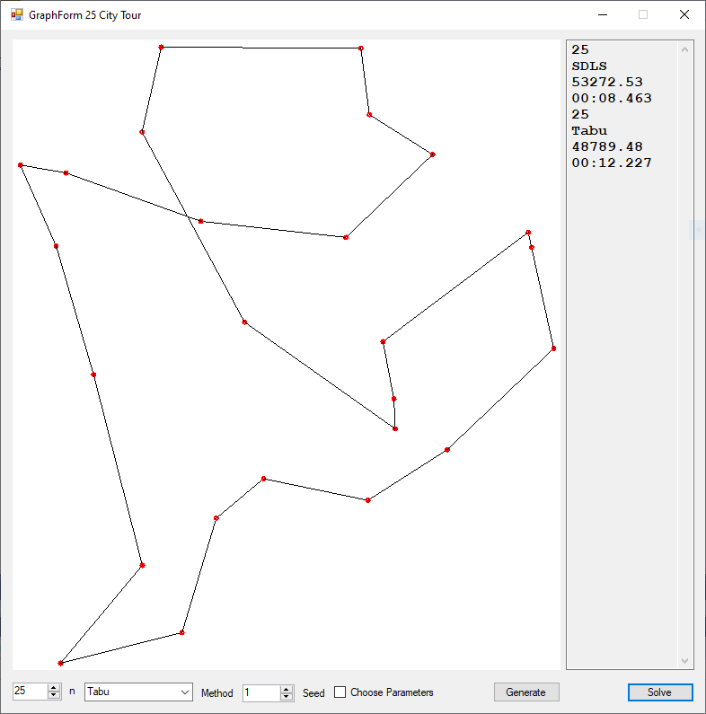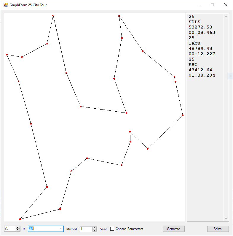With my software I am only able to solve small in size instances of the TSP. My implementations in a single computer application to solve toy random instances of the TSP for 3 to 25 number of locations are: brute force (3 to 9 cities), steepest descent local search (SDLS) from http://www.cs.bham.ac.uk/~wbl/biblio/gecco2007/docs/p1226.pdf, tabu search, evolutionary hill climber (EHC), genetic algorithm (GA), simulated annealing, some hybrid methods, minimum spanning tree, etc.