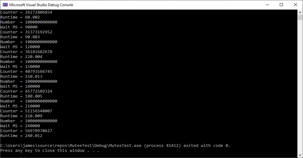 C:\Users\james\source\repos\MutexTest\Debug\MutexTest.exe (process 49516) exited with code 0.