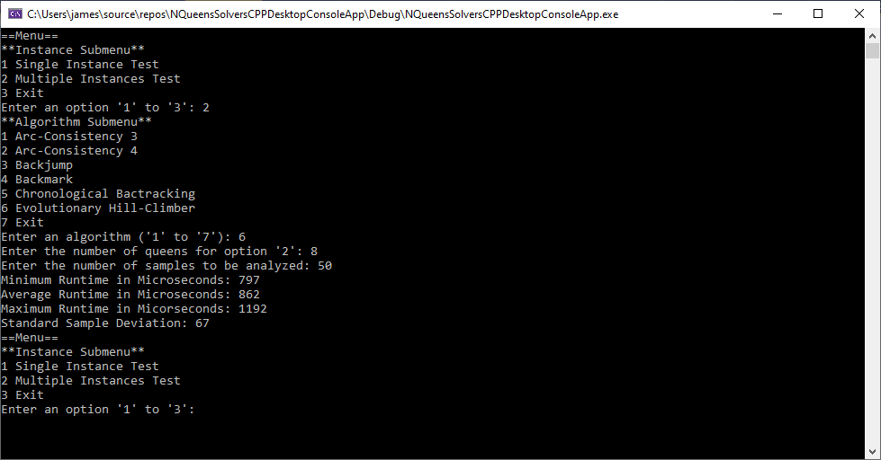 The first five algorithms were stated in pseudocode in the excellent treatise Foundations of Constraint Satisfaction by Edward Tsang. Below are six runs of my test C++ application (Win32 Console App) using 8 queens and 50 samples.