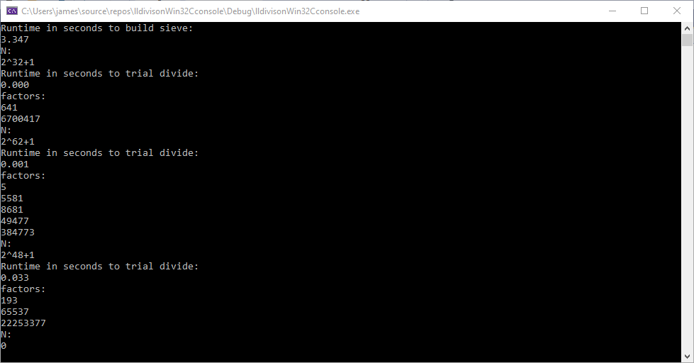The sieve of Eratosthenes handles primes up to an upper bound of 100,000,000. The number of primes is 5,761,455. Below are a few examples runs of the app. I have also created C source code for trial division and other factoring algorithms that use Professor Emeritus Arjen K. Lenstra’s Free Large Integer Package also known as lip.