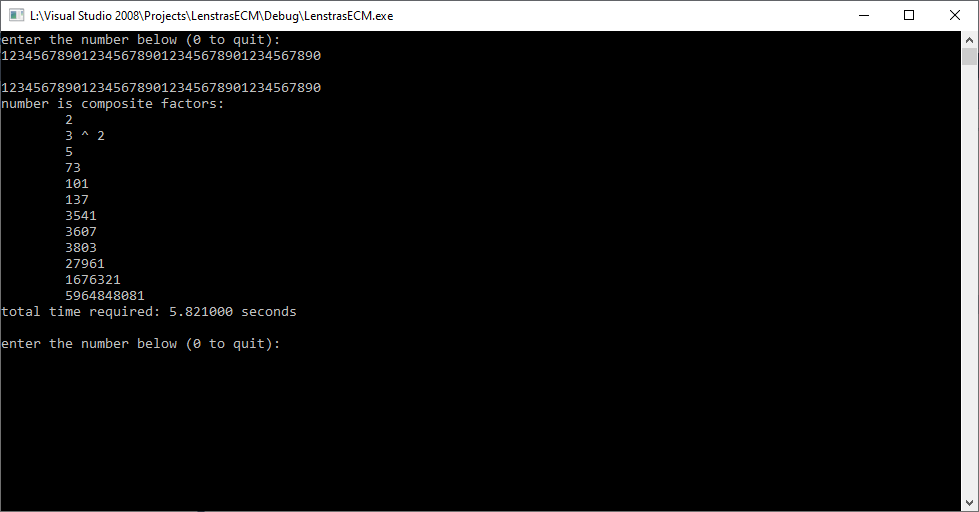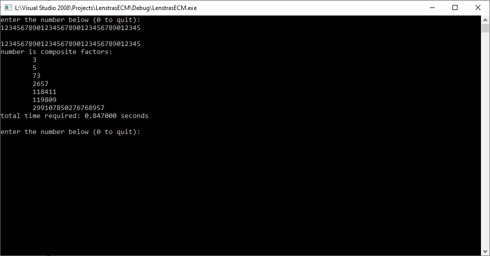 These algorithms are not guaranteed to completely factor these relatively large numbers. I gave up on using the elliptic curve method for numbers of greater than 40-digits. I have to give up on Brent’s modification of the Pollard rho method for numbers of more than 70-digits.