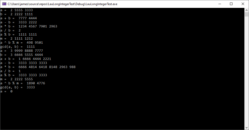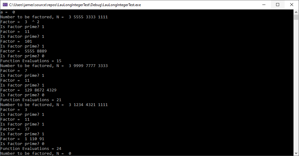 I have developed a long integer package in C++ using H. T. Lau’s “A Numerical Library in C for Scientists and Engineers”. That library is based on the NUMAL Numerical Algorithms in Algol library. I use 32-bit integers (long) as the basis of the LongInteger type. The base (radix) is 10000 which is the largest base using 32-bit integers. As a test of the library, I use Pollard’s original rho factorization method. I utilized the Alfred J. Menezes et al “Handbook of Applied Cryptography” Miller-Rabin algorithm and ANSI X9.17 pseudo random number generator with Triple-DES as the encryption algorithm. I translated Hans Riesel Pascal code for Euclid’s algorithm and the power modulus technique. I don’t use dynamic long integers a la Hans Riesel’s Pascal multiple precision library. The single precision is 32 32-bit longs and multiple precision 64 32-bit longs.