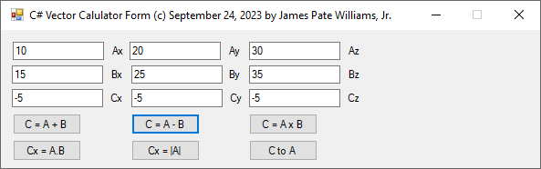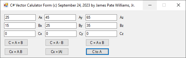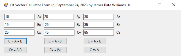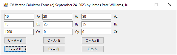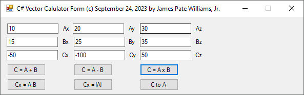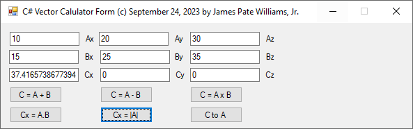 C# Three-Dimensional Cartesian Vector Calculator (c) September 24, 2023, by James Pate Williams, Jr. All Applicable Rights Reserved