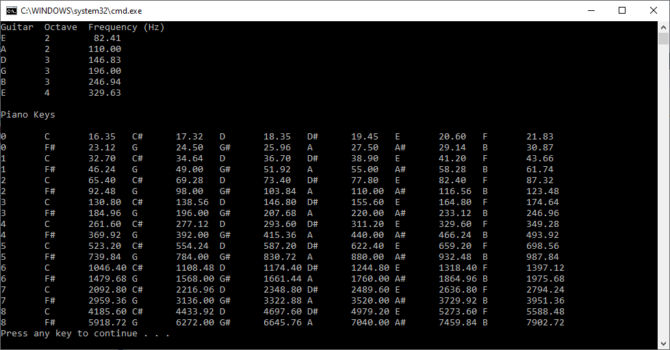 cout << "Guitar\tOctave\tFrequency (Hz)" << endl;