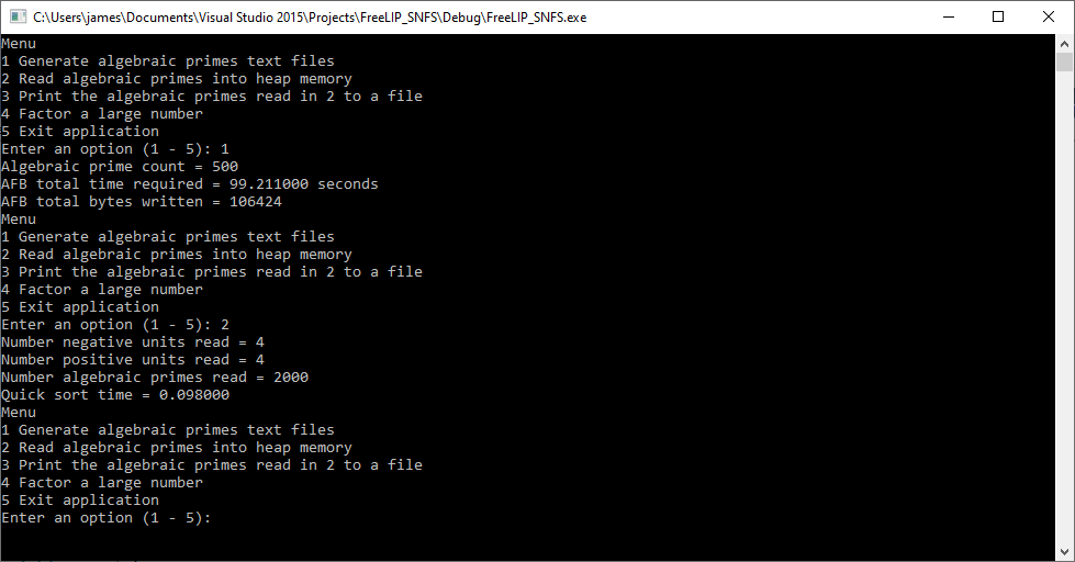 I am in the progress of translating (porting) my J. M. Pollard’s algorithm “Factoring with Cubic Integers” C# application to a Free LIP based vanilla C Windows 32-bit console application. The first phase of the method is to generate two factor bases namely a rational prime factor base and an algebraic integer prime factor base. I have included some preliminary results from this fast-moving computer programming task. I generated 2012 algebraic integer primes in about a minute and thirty seconds.