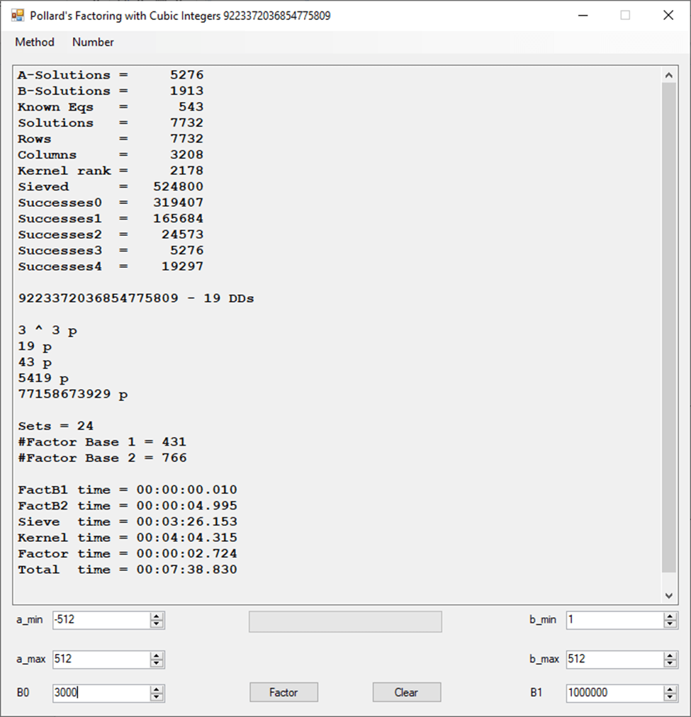 A-solutions have no large prime. B-solutions have a large prime between B0 and B1 exclusively which is this case is between 3272 and 50000 exclusively. The known equations are between the rational primes and the cubic primes and their associates of the form p = 6k + 1 that have -2 as a cubic residue. There are 81 rational primes of the form and 243 cubic primes but we keep many other associates of the cubic primes so more a and b pairs are successfully algebraically factored. In out case the algebraic factor base has 868 members. The rational prime factor base also includes the negative unit -1. The kernel rank is the number of independent columns in the matrix. The number of dependent sets is equal to columns – rank which is this case 1701 – 423 = 1278. The number of (a, b) pairs sieved is 326434. Successes0 is the pairs that have gcd(a, b) = 1. Successes1 is the number of (a, b) pairs such that a+b*r is B0-smooth or can be factored by the first 500 primes and the negative unit. r is equal to 2^27. Successes2 is the number of (a, b) pairs whose N[a, b] = a^2-2*b^3 can be factored using the norms of the algebraic primes. Successes3 is the number of A-solutions that are algebraically and rationally smooth. Successes4 is the number of B-solutions without combining to make the count modulo 2 = 0. Successes3 + Successes4 should equal Successes2 provided all proper algebraic primes and their associates are utilized.