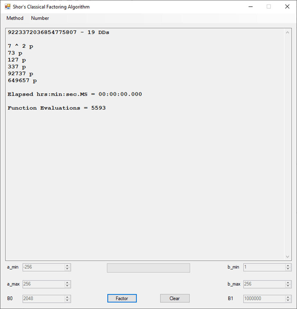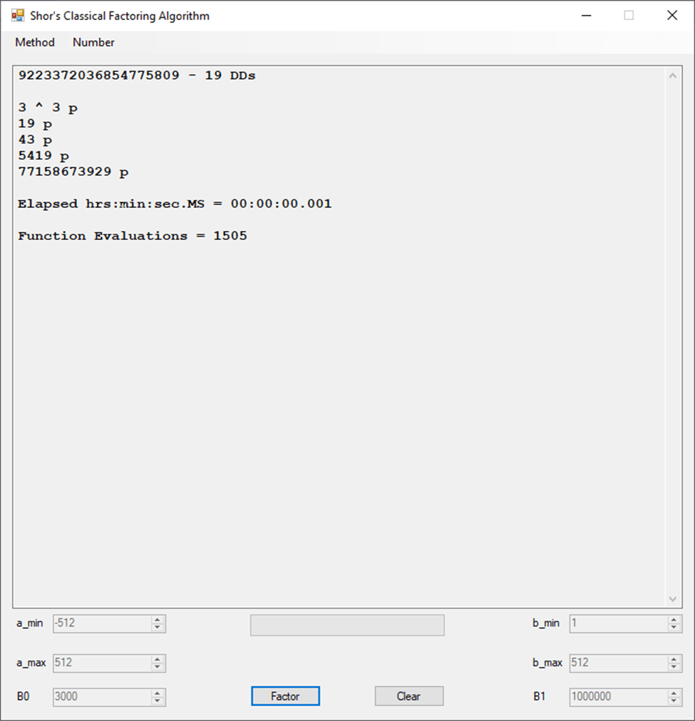 Back on Thursday, January 10, 2019, at 02:40 AM I started implementing J. M. Pollard’s factoring with cubic integers method and a classical variant of Shor’s quantum computer factoring algorithm. I have probably implemented at least three versions of Pollard’s magnificent work which led to the special number field sieve fast factoring method. I am working on translating my C# code of these two algorithms to Arjen K. Lenstra’s Free Large Integer Package in the C computer programming language. Appended to this electronic missive are factorizations of two small 19-decimal digit numbers 2^63-1 and 2^63+1. Pollard’s method requires that the exponent be divisible by three. Thus, we write the numbers as 2^ (21 * 3) plus or minus 1. You can factor numbers with different bases and small addends and subtrahends as long as the exponent is zero modulo 3. You will notice that Shor’s algorithm is very fast on these small numbers.