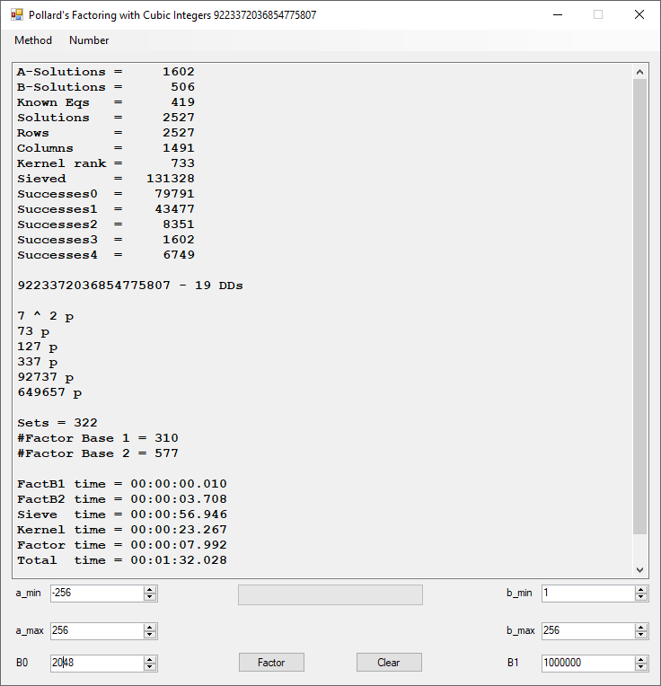 A-Solutions = 973 B-Solutions = 234 Known Eqs = 614 Solutions = 1821 Rows = 1821 Columns = 1701 Kernel rank = 423 Sieved = 326434 Successes0 = 200863 Successes1 = 47073 Successes2 = 2708 Successes3 = 973 Successes4 = 1735 2417851639229258349412354 - 25 DDs 2 p 65537 p 414721 p 44479210368001 p Sets = 189 #Factor Base 1 = 501 #Factor Base 2 = 868 FactB1 time = 00:00:00.000 FactB2 time = 00:00:05.296 Sieve time = 00:00:17.261 Kernel time = 00:00:06.799 Factor time = 00:00:02.327 Total time = 00:00:31.742