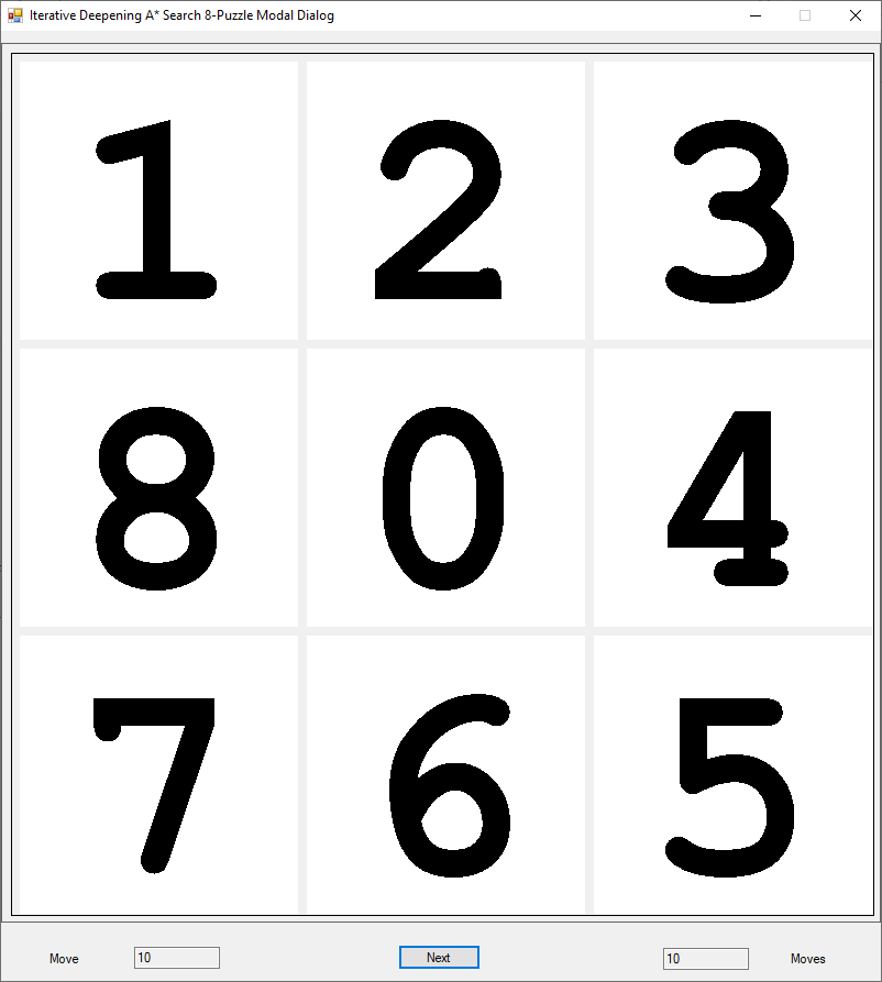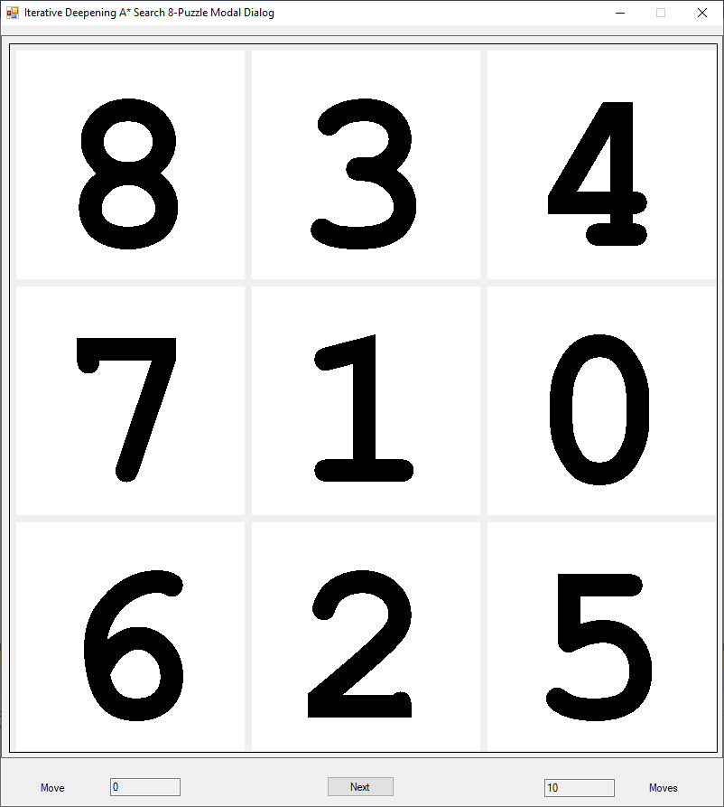 A* search is a complete and optimal informed or heuristic search algorithm. A good source for information on uniformed and informed search procedures is the tome “Artificial Intelligence A Modern Approach First and/or Second Edition” by Stuart Russell and Peter Norvig. The second edition has more info on the 8-puzzle and the 15-puzzle. Iterative deepening A* search is also a complete and optimal search algorithm. Below is an instance of the 8-puzzle that requires 10 steps to reach the goal state. I use a different goal state than Russell and Norvig in the second edition of their textbook.